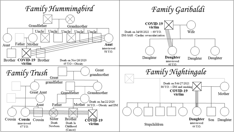 The participants, 12 family members of fatal victims of COVID-19, are presented in Figure 01, Figure 02 and Figure 03 (family genogram, whose caption is in Figure 04). This instrument was adapted to contextualize the interviewee in relation to the victimized relative, with emphasis on the degree of kinship between them, age of both, date of death and presence of comorbidities of the victim (Systemic Arterial Hypertension (SAH) and Diabetes Mellitus (DM), among others) and projection of the type of bond they had with each other, based on Mitchell's Psychofigure (8).
