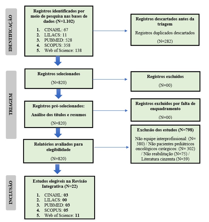 A identificação de estudos Figura 1 por meio de bancos de dados e de registros culminaram em 1.102 trabalhos, dos quais foram captados para a amostragem final 22 pesquisas primárias.