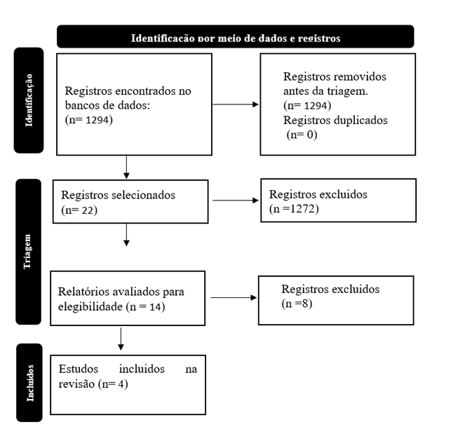 Com as buscas, foram localizadas 136 publicações na BVS, 548 na PubMed, 325 na CINAHL, 71 na Scopus e 214 na PsycINFO, totalizando 1.294 publicações. Após a exclusão das duplicidades e aplicação dos critérios de elegibilidade restaram 353 artigos. Considerando a correspondência com a pergunta de busca foram selecionados 22 artigos para leitura dos resumos, sendo excluídos 14 deles nessa etapa. A leitura na íntegra dos 08 artigos restantes, houve a seleção de 04 publicações para análise final, conforme ilustra o fluxograma da figura 1.