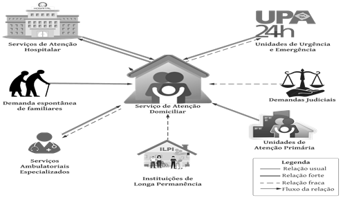 Na perspectiva da articulação do SAD estudado com os demais serviços da rede de saúde, houve o predomínio (59,3%) de relações com serviços hospitalares e unidades de urgência e emergência, sugerindo que a atuação deste serviço pode deter caráter substitutivo à internação hospitalar. Este caráter hospitalocêntrico é previsto na legislação normativa sobre a AD no Brasil7, contudo, é interessante ressaltar que o hospital nem sempre consegue atender às demandas de cuidados integrais e longitudinais de idosos.