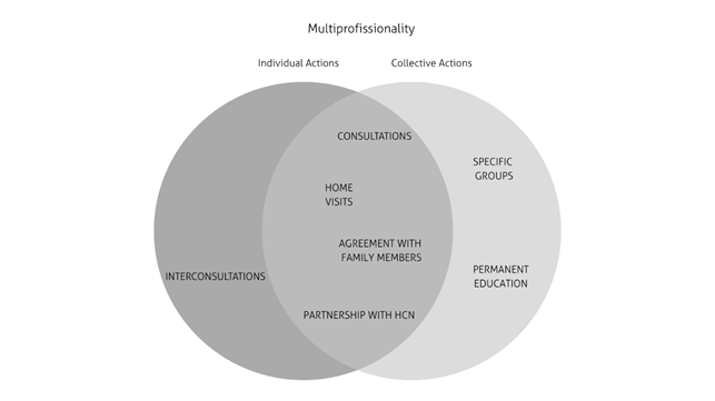 The nurses participating in the research highlighted that the development of actions aimed at QOL carried out by the health network of the city is done both in a uni and multiprofessional way, which is a positive aspect. The main actions mentioned were interconsultations, nursing consultations, home visits, pacts with family members, partnership with the Health Care Network (HCN), realization of specific groups and permanent education. The multiprofessional team is also cited as a supporter in this process.
