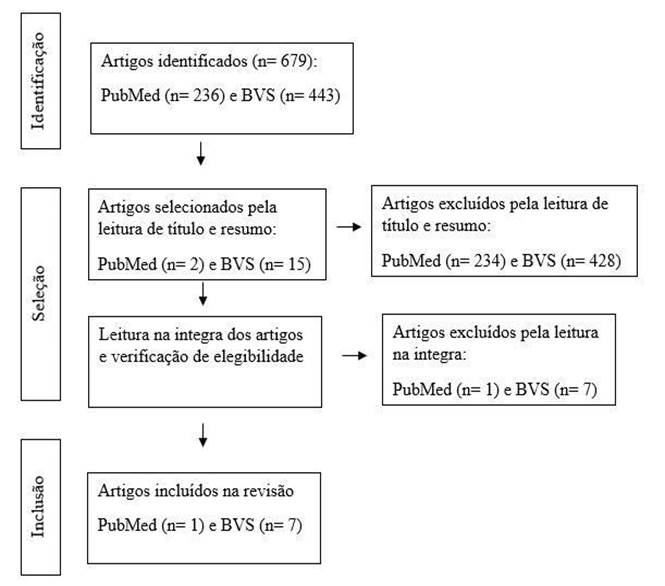 By adding these filters, 443 articles emerged in the VHL and 236 articles in PubMed. The exclusion criteria were repeatedly indexed articles, studies in the form of monographs, dissertations and theses and those that did not meet the objectives of this research. After reading the titles and abstracts, a sample of 17 articles was obtained (15 studies in the VHL and 2 in PubMed).