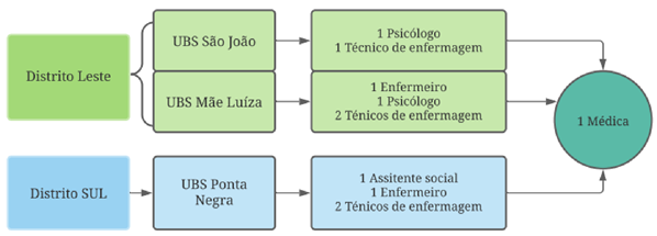 Os profissionais participantes deste estudo constituíram-se de 11 profissionais de saúde, das equipes de consultório na rua da cidade de Natal. A figura 1 apresenta a distribuição e a composição dessas equipes.
