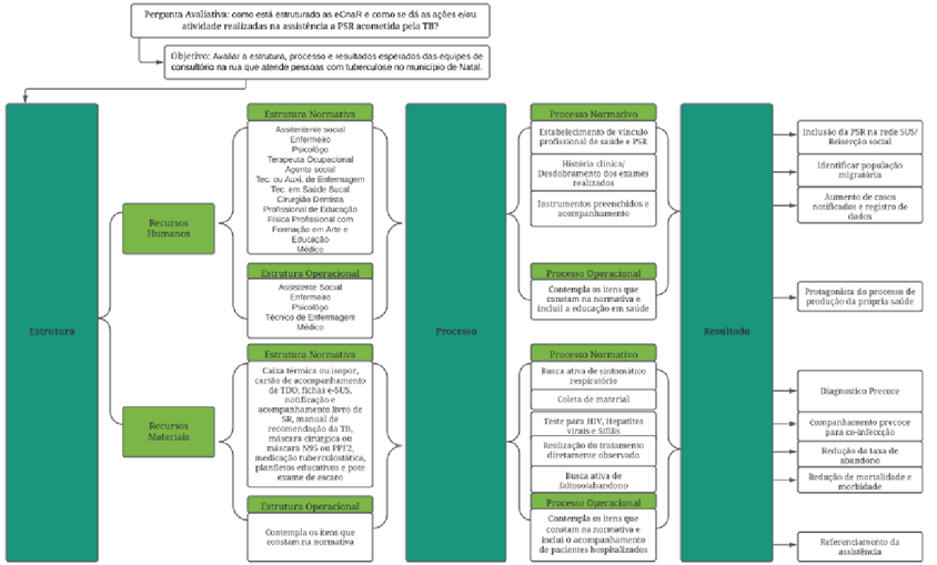 A elaboração do modelo lógico-operacional, no qual foram identificados os elementos relacionados à Estrutura, Processo e Resultado, das equipes de Consultório na Rua (eCnaR) que prestam atendimento a pessoas que vivem com Tuberculose no município de Natal–RN, permitiu uma visualização e compreensão abrangente da estrutura dessas equipes e das ações empreendidas para cuidar das pessoas em situação de rua (PSR) que enfrentam a Tuberculose.