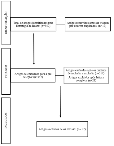 Após a busca realizada dos artigos nas bases de dados citadas anteriormente, a pesquisa se limitou a 359 artigos, cujo 119 foram referentes a MEDLINE e 240 a LILACS. Por não estarem dentro dos critérios de inclusão e da temática proposta, foram excluídos 345; sendo assim foram incluídos 14 artigos, que estavam dentro dos critérios de elegibilidade.