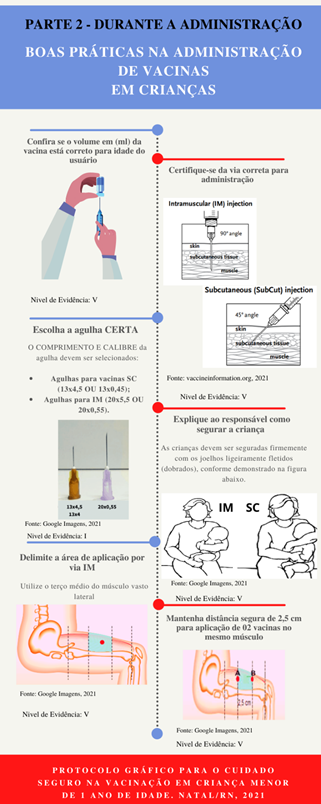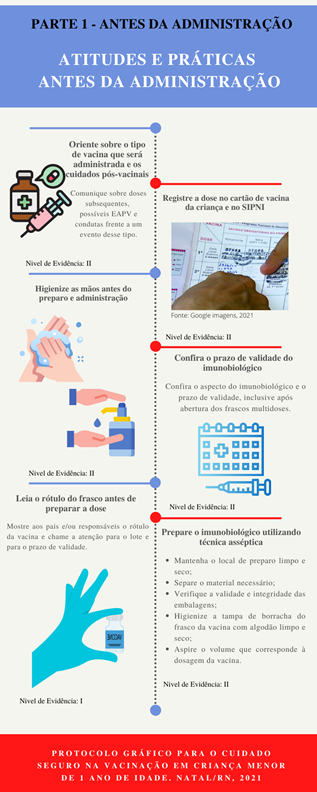 A estruturação do protocolo seguiu a sequência definida por estas autoras, assim os achados foram dispostos em três seções distintas: antes da administração da vacina, durante e após. Cada etapa das boas práticas descritas no protocolo foi enriquecida com uma imagem correspondente, proporcionando uma abordagem visual que facilitasse a assimilação das informações e a compreensão da mensagem transmitida.