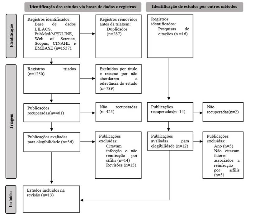 Foram considerados os seguintes critérios de elegibilidade: estudos primários cujos autores verificaram os fatores de risco para a reinfecção de sífilis em adultos; publicados em português, inglês ou espanhol; no período de janeiro de 2017 a março de 2024. Foram excluídos da amostra de revisão: informações de livros e/ou capítulos, descrição de estudos de revisões integrativas, sistemáticas da literatura e/ou metanálises, bem como artigos de reflexão, artigos que citassem fatores de risco para infecção por sífilis e artigos relacionados a sífilis gestacional.