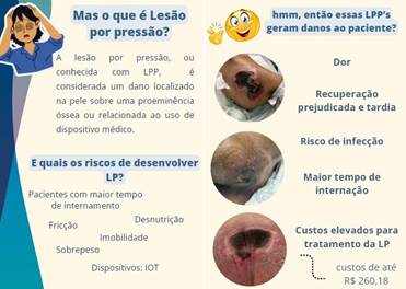 A primeira seção foi realizada uma capacitação abrangente com todos os membros da equipe abordando os efeitos negativos no surgimento das LP’s, as possíveis complicações e as formas de preveni-las. Para esse momento foi utilizado um card impresso, confeccionado pelos discentes, utilizando exemplos e figuras para melhor entendimento dos trabalhadores, conforme a figura 1.