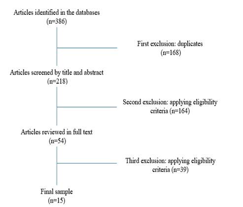 The database search identified a total of 386 articles: 287 from MEDLINE, 51 from BDENF, 44 from LILACS, and 4 from IBECS. The stages of the publication selection process are detailed in Figure 1.