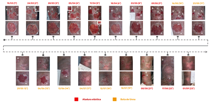 No 21º, optou-se pelo retorno ao uso da atadura elástica devido ao surgimento de novas lesões por fricção da bota de unna com a pele – nomeadas G, H e I, com áreas de, respectivamente, 2,4 cm², 8,14 cm² e 3,06 cm²; com tecido de granulação normocorado e bordas difusas, sem sinais de infecção. Então, foi utilizada tela não aderente revestida com petrolatum como curativo primário nestas lesões.