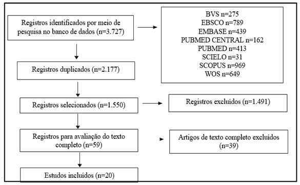 Foram incluídos todos os estudos primários, sem restrição de delineamento metodológico, nos idiomas português, inglês e espanhol. A busca bibliográfica em todas as bases de dados originou 3.727 estudos. Essas produções foram adicionadas no gerenciador de referências EndNote para retirada de duplicatas, encontrando-se 2.177 documentos em duplicidade, e, posteriormente, incorporadas no Rayyan. A seleção dos estudos ocorreu em duas fases, a primeira considerou o título e o resumo dos estudos, assim os que potencialmente responderam à questão seguiram para a segunda fase, a qual correspondeu aleitura do texto completo. Foram incluídas nessa fase 59 produções, todas foram acessadas na íntegra, tendo sido excluídas 39, perfazendo, assim, 20 artigos para integração nesta revisão (Figura 1).