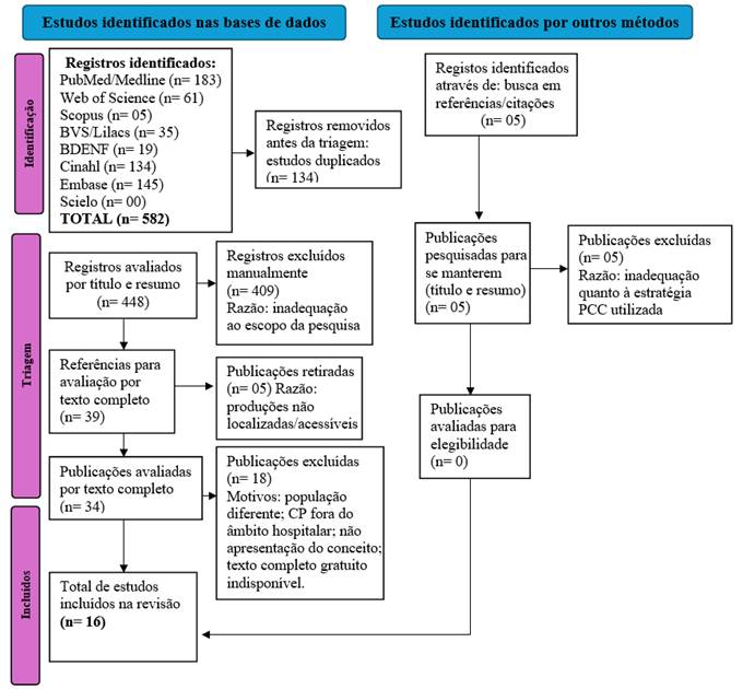 A busca foi realizada em maio de 2024 em oito base de dados: PubMed/Medline (Medical Literature Analysis and Retrieval System Online); BVS/Lilacs (Literatura Latino-Americana e do Caribe em Ciências da Saúde); Embase (Excerpta Medica dataBASE); Scopus; Cinahl (Cumulative Index to Nursing and Allied Health Literature); Web of Science (WoS), BDENF (Base de Dados de Enfermagem) e Scielo (Scientific Electronic Library Online). Buscando-se por produções científicas que tivessem abrangido a temática na supracitada estratégia “PCC”.