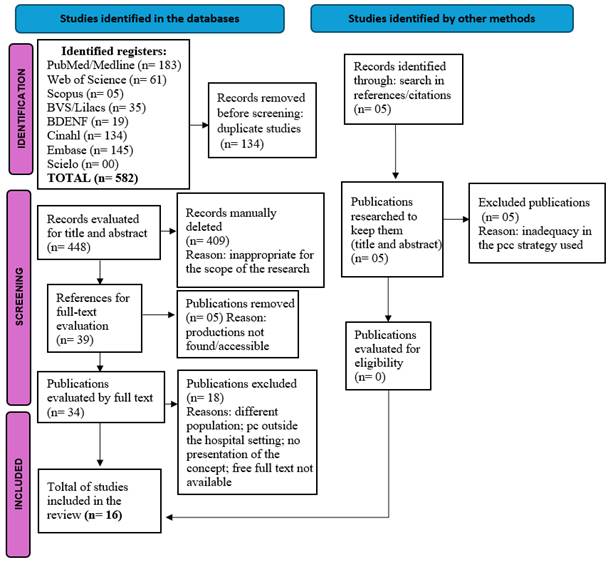 The search was conducted in May 2024 in eight databases: PubMed/Medline (Medical Literature Analysis and Retrieval System Online); BVS/Lilacs (Latin American and Caribbean Literature in Health Sciences); Embase (Excerpta Medica dataBASE); Scopus; Cinahl (Cumulative Index to Nursing and Allied Health Literature); Web of Science (WoS), BDENF (Nursing Database) and Scielo (Scientific Electronic Library Online). The search was for scientific productions that had covered the theme in the aforementioned “PCC” strategy.