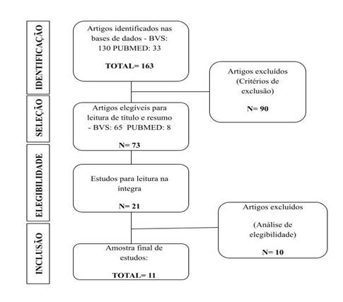 Foram encontrados 163 artigos totais e, após a aplicação dos filtros, 90 artigos foram excluídos. Foi realizada a leitura de 73 resumos, destes, foram rejeitados 52, apenas 21 se enquadraram nos critérios de inclusão, 7 artigos foram excluídos por não responderem a pergunta norteadora e 3 por não se encaixarem nos critérios de inclusão. Assim, a amostra final foi composta por 11 artigos (Figura 1).