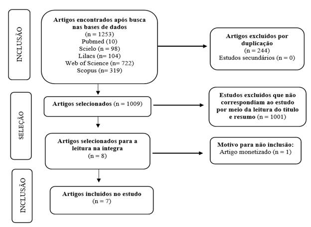 Constitui a apresentação desta revisão integrativa, na qual a partir da busca nas bases de dados, 1253 artigos foram encontrados (Lilacs=104; Pubmed= 10; Scielo= 98; Scopus= 319; Web of Science= 722). Desse total, 244 duplicatas foram excluídas. Posteriormente, à leitura do título e resumo, restaram oito artigos, sendo selecionados para leitura na íntegra e, após a leitura, um artigo foi excluído por ser monetizado. A amostra final foi composta por sete artigos, os quais foram incluídos na presente revisão (Figura 1).