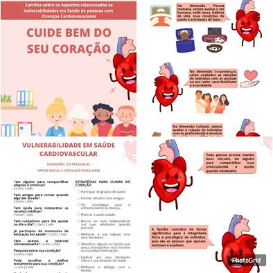 Com base nisso e nas subdimensões da VS, Pessoa Humana, Co-presença e Cuidado, elaborou-se a cartilha educativa intitulada: “Cuide bem do seu coração: cartilha sobre os aspectos relacionados às vulnerabilidades em saúde de pessoas com doenças cardiovasculares”, nas cores vermelho e branco, composta por vinte páginas e fonte principal “Open Sans”. O material foi dividido em quatro tópicos, na seguinte sequência: 1. Apresentação: Buscou-se contextualizar a temática com dados epidemiológicos e sobre as estratégias de promoção da saúde. 2. Vulnerabilidades em saúde e doenças cardiovasculares: Explicou-se sobre o conceito de VS, os impactos e a dimensionalidade. 3. Vulnerabilidade em saúde cardiovascular: Iniciou-se a explicação sobre cada dimensão e as respectivas subdimensões, bem como foram realizadas perguntas sobre o paciente, de acordo com a subdimensão apresentada, a fim de identificar situações de VS; ao lado de cada pergunta, elaborou-se estratégias a fim de contribuir para amenizar essas VS, bem como, melhorar a qualidade de vida do paciente. 4. Fechamento da cartilha: Por fim, o personagem “Coraçãozinho” fortalece a ideia apresentada na cartilha, por meio das estratégias para mitigar as situações de VS identificadas, e apresentou-se a importância de procurar ajuda de um profissional da saúde(10).