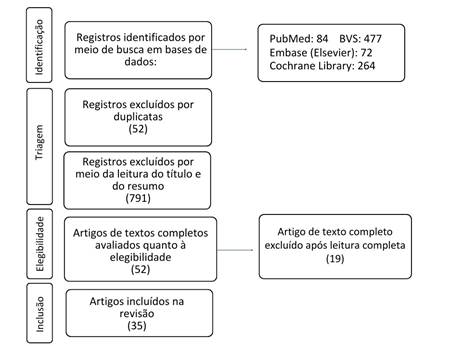 A busca nas bases de dados identificou 897 publicações com descritores individuais e combinados, foram avaliados na plataforma “Rayyan Reviews” por dois avaliadores no modo cego de avaliação de título. Após a exclusão das duplicatas e a triagem dos títulos e resumos, foram excluídas 52 duplicatas e 791 publicações pela triagem do título e resumos. Destes, 54 atenderam aos critérios de seleção especificados para a leitura na íntegra. Após avaliação foram excluídos 19 que não tinham relação com a pergunta norteadora. Resultando em 35 artigos elegíveis (Figura 1).