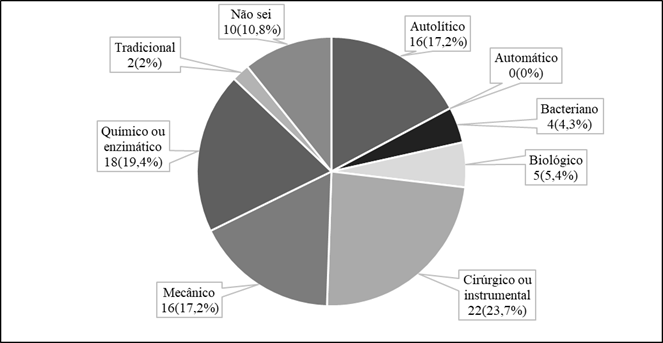 (X) Cirúrgico ou instrumental (X) Tradicional (X) Mecânico (X) Automático (X) Autolítico (X) Autônomo (X) Químico ou enzimático (X) Biológico (X) Bacteriano (X) Não sei Preenchimento obrigatório Aceita mais de uma resposta |