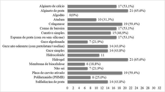 (X) Alginato de cálcio (X) Alginato de prata (X) Gaze algodonada (X) Placa de carvão ativado (X) Hidrogel (X) Atadura (X) Hidrofibra (X) Espuma de prata (com e sem silicone) (X) Hidrocoloide (X) Gaze simples (X) Sulfadiazina de prata (X) Gaze não aderente (com petrolatum/vaselina) (X) Curativo simples (X) Membrana de biocelulose (X) Algodão (X) Colagenase (X) Polihexanida (PHMB) (X) Creme de barreira (X) Não sei Preenchimento obrigatório Aceita mais de uma resposta |
