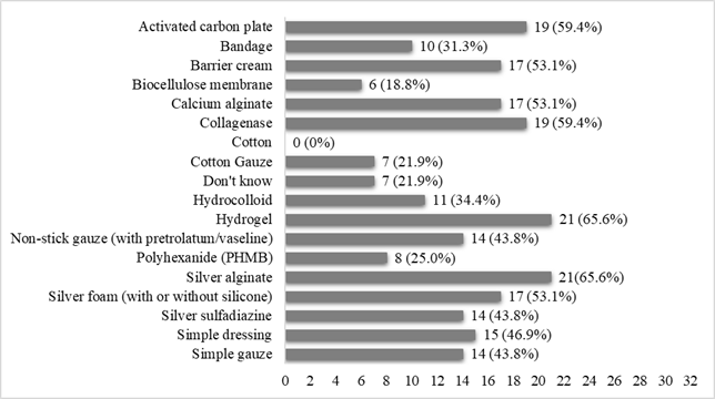 Over 50% of participants indicated the use of hydrogel, silver alginate, hydrocolloid, activated charcoal sheets and collagenase as treatments used for wounds. A survey conducted using a database(42) surveyed the most commonly used dressings, and the findings point to essential fatty acids, hydrocolloid sheets, hydrogel, transparent film, silver sulfadiazine and collagenase. The participants' knowledge on the subject is lacking in terms of depth based on the types of dressings available. The academics have basic experience, but they need continuous improvement, due to product updates on the market, which allows them to be more efficient in treating wounds.