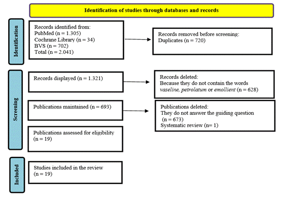 The first step of searching the databases and virtual library using the descriptors resulted in a total of 2,041 publications corresponding to the topic. Articles were included if their abstracts contained at least one of the following words: vaseline, petrolatum or emollient and if they were published between January 2012 and March 2023. These articles were then assessed through their abstracts to see if there was a link with the guiding question: what is the scientific evidence on the use of petrolatum and its derivatives for skin and wound care?