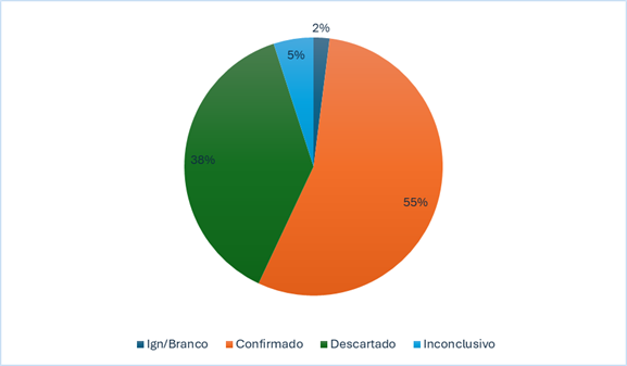 É vital ressaltar a importância do correto preenchimento das fichas de notificação, classificando os casos como confirmados, inconclusivos ou descartados. Conforme ilustrado no Gráfico 4, 55% dos casos foram confirmados, 5% inconclusivos e 38% descartados. Esses dados destacam a necessidade de um monitoramento rigoroso e de uma documentação precisa para aprimorar a eficácia das estratégias de saúde pública (13,27).