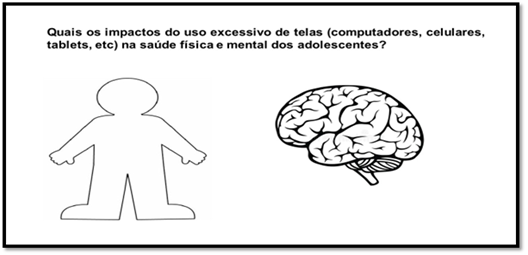 To carry out the activity, nursing students created a material (Figure 1) using printed figures representing mental health (brain) and physical health (human body), which were glued to poster board. Above them, the following question was written: What are the impacts of excessive screen use (computers, cell phones, tablets, etc.) on adolescents’ physical and mental health?