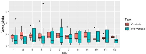 Para realizar o cálculo do tamanho de amostra, utilizamos um nível de significância de 5% e um poder de 90%. Para determinar o tamanho do efeito, utilizamos como amostra preliminar as observações da vazão no 5º dia de coleta, e observamos um tamanho de efeito igual a 1,61. Com base nesses valores, o tamanho de amostra necessário para cada grupo (controle e intervenção) foi de 7,4 indivíduos.