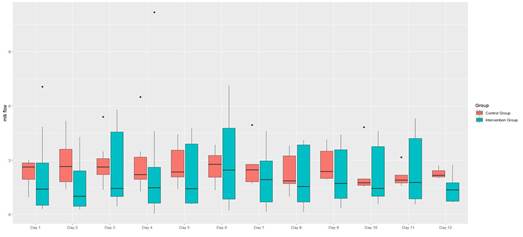 To calculate the sample size, we used a significance level of 5% and a power of 90%. To determine the effect size, we used the flow observations on the 5th day of collection as a preliminary sample, and observed an effect size of 1.61. Based on these values, the required sample size for each group (control and intervention) was 7.4 individuals.