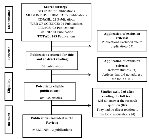 The literature search was conducted in the following databases: Medical Literature Analysis and Retrieval System Online (MEDLINE) through the US National Library of Medicine National Institutes of Health (PubMed) search engine, in Latin American and Caribbean Literature in Health Sciences (LILACS) through the Virtual Health Library (VHL), in the Cumulative Index to Nursing and Allied Health Literature (CINAHL), SCOPUS and Web of Science.