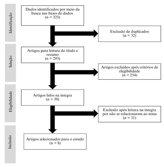 A busca resultou em 325 artigos referentes ao tema abordado, como demonstra a Figura 1. A seleção dos artigos se deu a partir da leitura dos títulos e dos resumos, sendo selecionados aqueles que se enquadraram dentro dos critérios de inclusão e exclusão, como também artigos duplicados. Incluíram-se estudos em que foram utilizados fitoterápicos e/ou plantas medicinais em lesões de pele, e artigos indexados nas bases de dados publicados no período de 2013 a 2023, sendo excluídas teses, dissertações, monografias, e aqueles que não respondiam à questão norteadora.