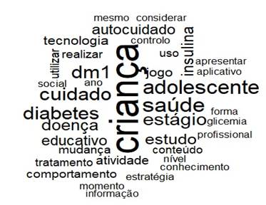 Below is the word cloud generated by IRAMUTEQ. In the word cloud, the terms with the highest frequency and importance within the corpus are closer to the center and larger. Thus, we can conclude that educational technologies are being used in the health care of children and adolescents with type 1 diabetes mellitus.