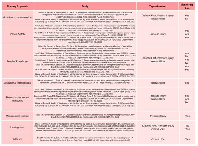 Among the ten studies, two reinforce the importance of adequate documentation of care; three address patient safety; one emphasizes educational interventions; two consider the impact on healing time; one discusses the appropriate staffing levels; and another focuses on the impact of self-care. It is important to emphasize that, even when QOL monitoring was not directly measured in some studies, it was possible to observe significant changes in patients' quality of life, as reported by the studies themselves.