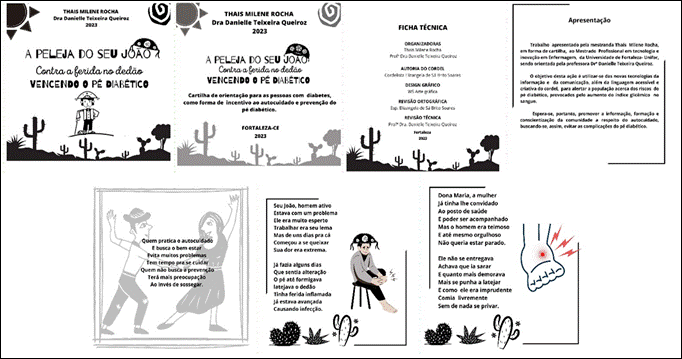 A etapa de criação do cordel foi constituída por dois processos: inicialmente, houve a pesquisa sobre a temática, juntando elementos conceituais e informativos para inserção à tecnologia. Sequencialmente, ocorreram a construção e a montagem do script do cordel “A peleja do seu João contra a ferida no dedão: vencendo o pé diabético”. Nesse momento, foram reunidos os conteúdos advindos da revisão integrativa realizada na fase 1 e, por meio de encontros síncronos com a pesquisadora e sua orientadora, transmitidos via Plataforma Google Meet, aconteceu a permissão para a construção inicial do cordel, tendo em conjunto a participação de uma cordelista, uma poetisa e juízes na elaboração de cordéis na área da saúde.