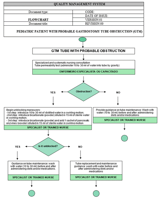 The flowchart was then built with information considered relevant, set out in the document entitled “PEDIATRIC PATIENT WITH PROBABLE GASTROSTOMY TUBE OBSTRUCTION (GTM)”. The flowchart of the constructed protocol is shown below (Figure 2).
