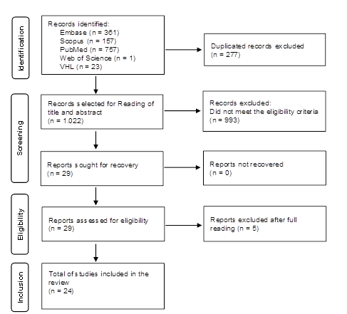 Figure translation: Identification. Records identified. Embase (n = 361). Scopus (n = 157). PubMed (n = 757). Web of Science (n = 1). VHL (n = 23). Duplicated records excluded (n = 277). Screening. Records selected for reading of title and abstract (n = 1,022). Records excluded: Did not meet the eligibility criteria (n = 993). Reports sought for recovery (n = 29). Reports not recovered (n = 0). Eligibility. Reports assessed for eligibility (n = 29). Reports excluded after full reading (n = 5). Inclusion. Total of studies included in the review (n = 24).