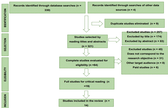 The search strategy identified 330 articles in the databases searched and 4 identified in other data sources, such as guidelines, guidance guides, and protocols. After removing duplicate studies, 321 articles were retrieved. The studies were selected by reading titles and abstracts, with 257 articles being excluded. Eligibility criteria were applied, and 45 full-text studies were excluded. As a result, 19 articles were selected for full-text critical reading, but only 14 were eligible for inclusion in the research.