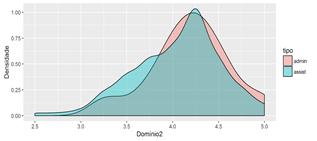 Figure 1 illustrates the score densities for administrative and clinical nurses in Domain 1. The density curves for both groups show very similar behavior, although the curve for administrative nurses has a more pronounced peak. This suggests that, overall, the responses of administrative and clinical nurses were quite similar for the statements in this domain.