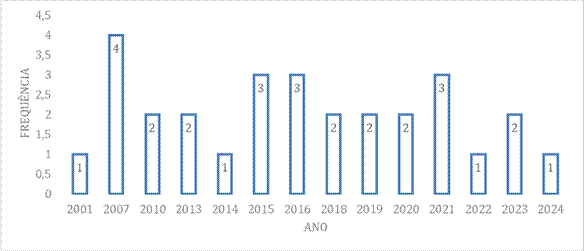 A amostra foi composta por 29 publicações, sendo 24 artigos, três manuais, duas teses/dissertações. As principais características dos estudos são apresentadas no Quadro 2. O ano de publicação variou entre 2001 e 2024, com número maior em 2007 (Figura 2).