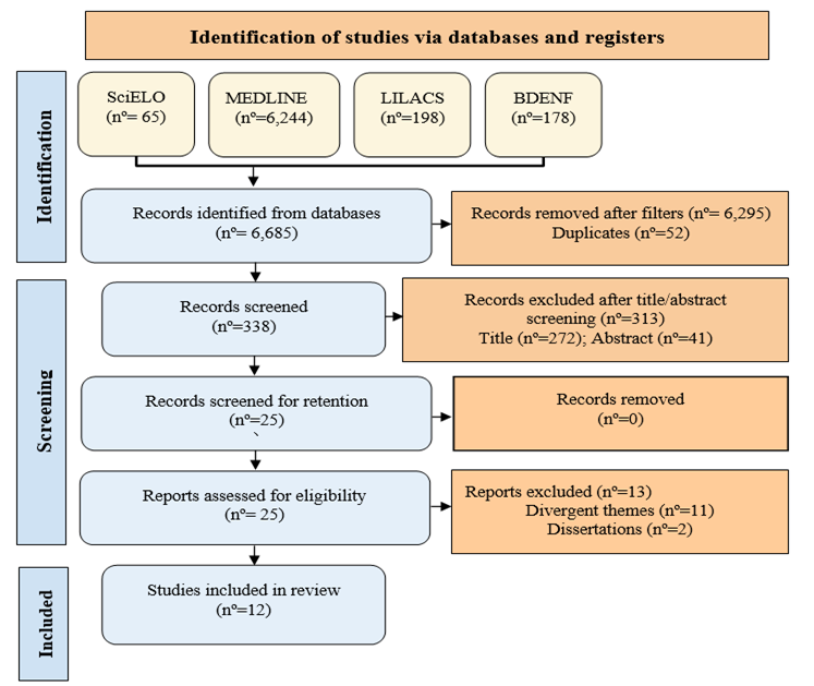 Based on a comprehensive analysis of the studies evaluated for eligibility, the inclusion stage consisted of selecting 12 articles to comprise the integrative review, which is organized in the PRISMA (Preferred Reporting Items for Systematic Reviews and Meta-Analyses) flowchart, as highlighted in Figure 1.
