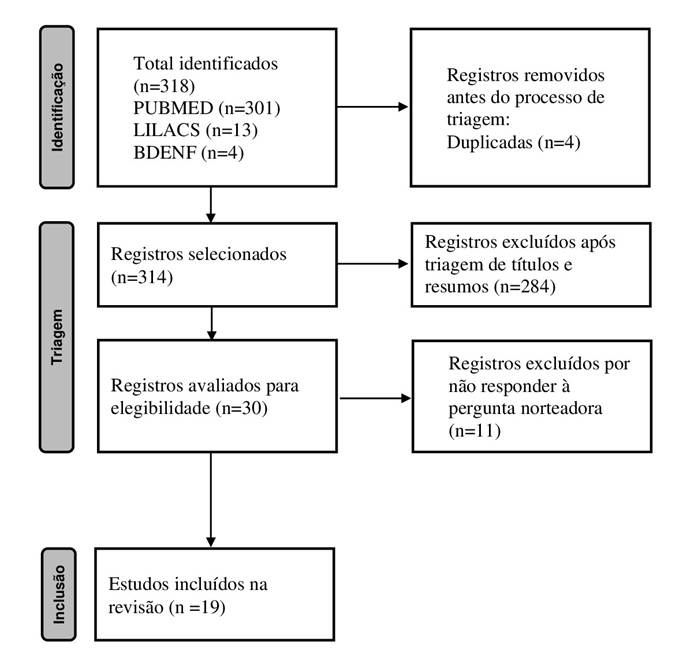 A partir da busca nas bases de dados, 318 registros foram identificados. Após exclusão de duplicatas e leitura de títulos e resumos, 30 artigos foram lidos na íntegra, destes, 19 artigos foram selecionados para compor a amostra final da revisão. Na Figura 1, apresenta-se o fluxograma de eleção dos estudos incluídos na revisão integrativa.
