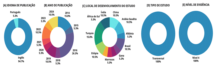 [A] Language of publication; [B] Year of publication; [C] Location where the study was conducted; [D] Type of study; and [E] Assessment of the level of evidence of the studies included in the review.
