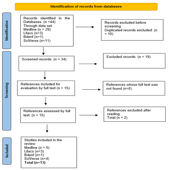 The articles selected to contain this study were reviewed by two independent reviewers according to the inclusion and exclusion criteria. The search and selection of articles are described in Figure 1 (Flowchart related to the selection process of articles according to PRISMA/2020) (13).
