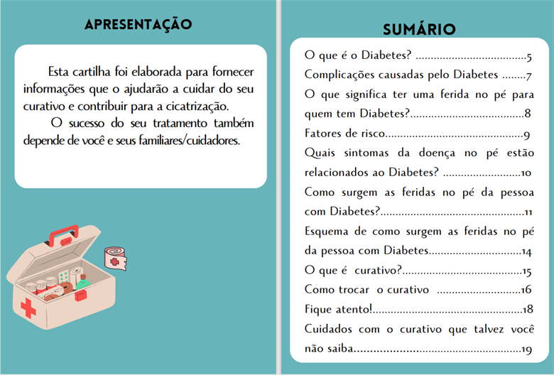 A cartilha foi idealizada com a intenção de auxiliar os pacientes e cuidadores no cuidado com o curativo na úlcera no pé, de maneira a estimular a melhora do autocuidado e adesão ao tratamento. Apesar do alto número de pessoas com esse tipo de complicação, não há estudos recentes que abordem o desenvolvimento e a verificação de tecnologia educacional com esse foco. Durante a pesquisa, foram encontrados muitos materiais sobre a prevenção de lesões e úlceras nos pés10-15, mas nenhum específico para o cuidado de feridas já existentes.