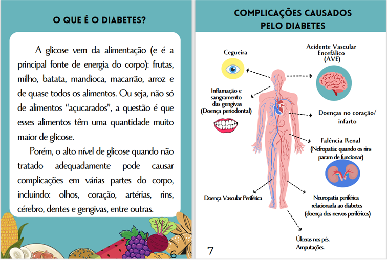 O texto explicando o diabetes foi ajustado para esclarecer que é uma doença crônica que altera o nível de glicose no sangue (hiperglicemia). A explicação sobre a glicose na alimentação foi modificada para incluir que a glicose é a principal fonte de energia e não vem apenas de alimentos doces. Além disso, ao longo da cartilha, o termo "problemas" foi substituído por "complicações".