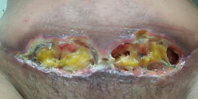 Dessa maneira, a paciente optou por seguir a conduta médica, mesmo sendo orientada pela enfermeira a não utilizar a pomada. Então, após 12 dias de uso da pomada, houve exposição do leito, que apresentou tecido necrótico em quase toda a extensão da ferida (Figura 2), e a paciente foi orientada pelo cirurgião a lavar a ferida no banho e aplicar colagenase com cloranfenicol. Porém, não apresentou boa evolução clínica e o leito da ferida apresentou aumento de tecido necrótico e esfacelo (Figura 3).