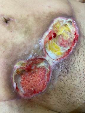 Legenda: deiscência com exposição de tecido adiposo, apresenta tecido inviável, bordas elevadas, maceração em porção inferior da borda e eritema perilesional.