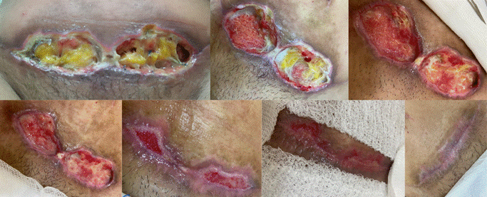 Após o início do tratamento com o DACC, a ferida evoluiu para fechamento total com tecido de epitelização em 67 dias, como relatado abaixo:
