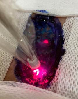 Legenda: Leito da ferida corado com azul de metileno a 1% de concentração e irradiação com 9 Joules de luz vermelha.