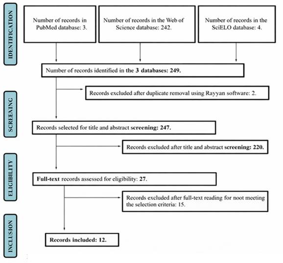 A total of 249 studies were identified through searches of the PubMed (n=3), SciELO (n=4), and Web of Science (n=242) databases, using the previously defined strategies. After duplicate removal with the aid of the Rayyan software, 247 records remained for title and abstract screening. At this stage, 220 studies were excluded for not meeting the eligibility criteria. Then, 27 articles were selected for full-text reading. After this complete assessment, 15 records were excluded for not meeting the inclusion criteria. Thus, 12 studies comprised the final sample of this study, as presented in Figure 1.